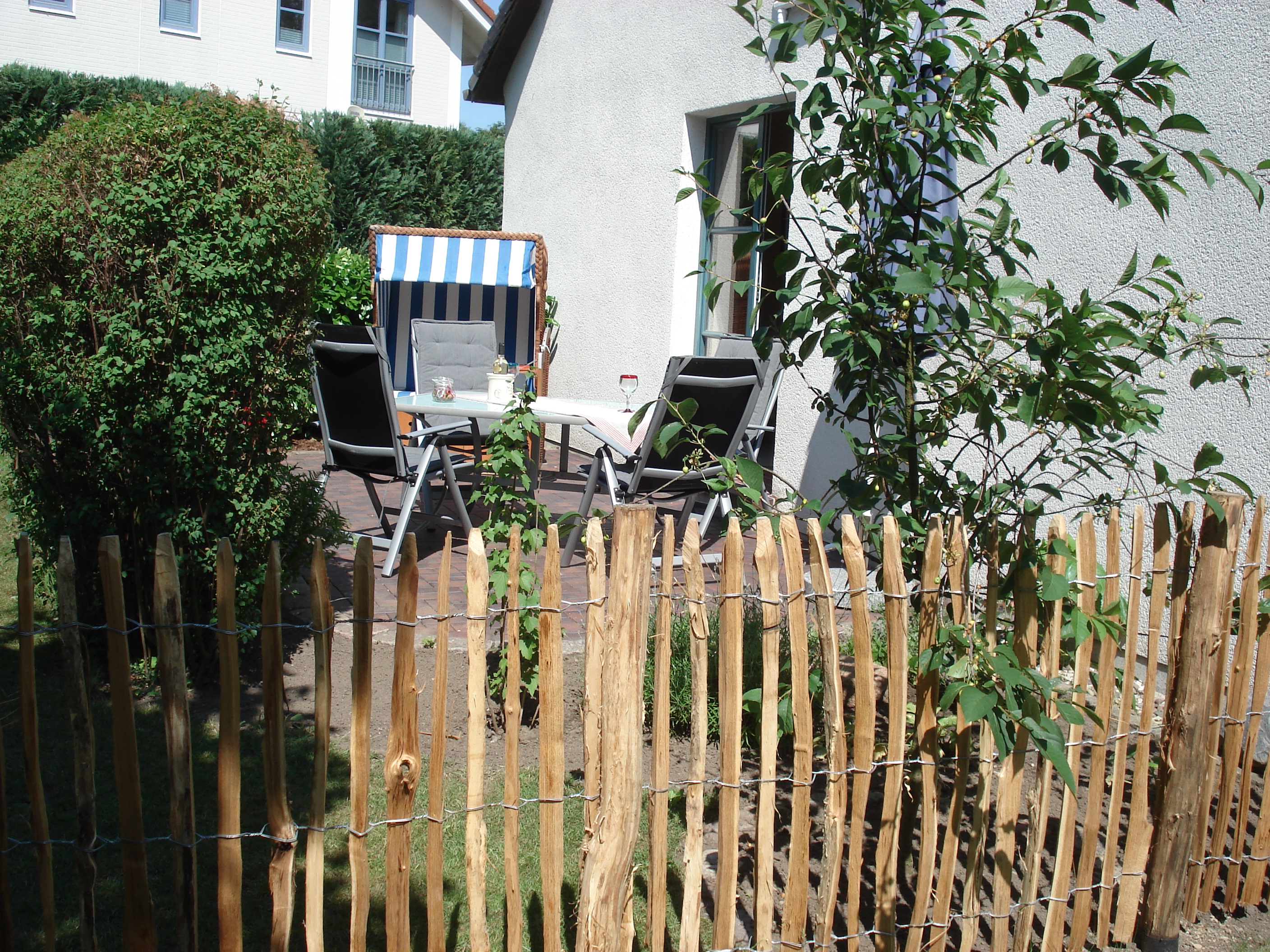 Eine eigene Terrasse mit Gartenmöbel + Strandkorb, sowie ein PKW Stellplatz am Haus gehören genauso dazu, wie auch 2 Fahrräder, ein Holzkohlegrill und ein kleines, separates Holzhaus als zusätzlicher Abstellraum.